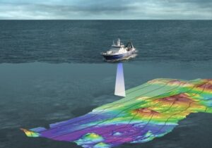 A multibeam echosounder (MBES) is a type of sonar that is used to map the seabed. It emits acoustic waves in a fan shape beneath its transceiver. The time it takes for the sound waves to reflect off the seabed and return to the receiver is used to calculate the water depth.